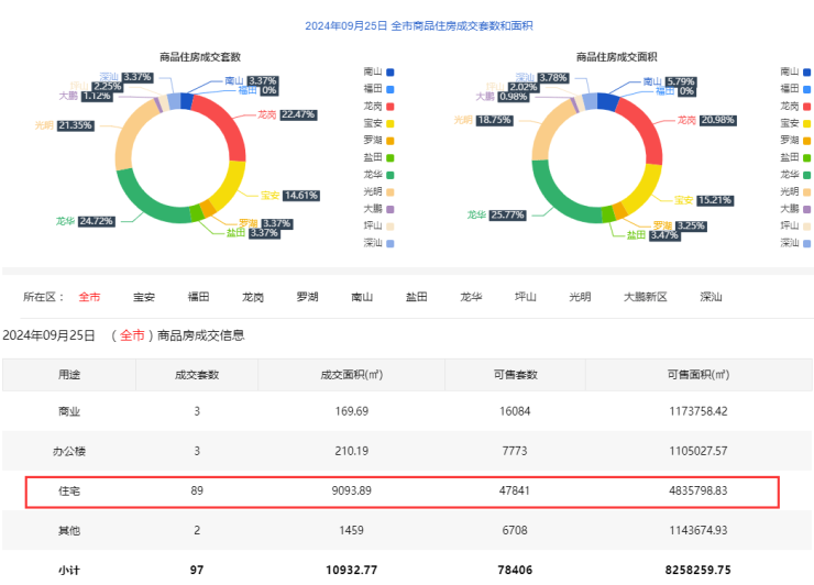 2024年9月25日新房住宅共网签89套。宝安13套;福田0套;龙岗20套;罗湖3套;南山3套;盐田3套;龙华22套;坪山2套;光明19套;大鹏1套;深汕3套。