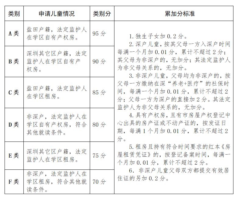 A类:100分1.学区户籍儿童,父母(或监护人)在学区的住房为住宅类商品房或原居民祖屋并实际居住。2.高级杰出人才、高级领军人才或海外高层次A类人才、现役军人子女,父母在学区实际居住。B类:90分学区地段外深圳户籍儿童、享受政府优惠政策人员子女,父母(或监护人)在学区住房为住宅类商品房并实际居住。C类:80分