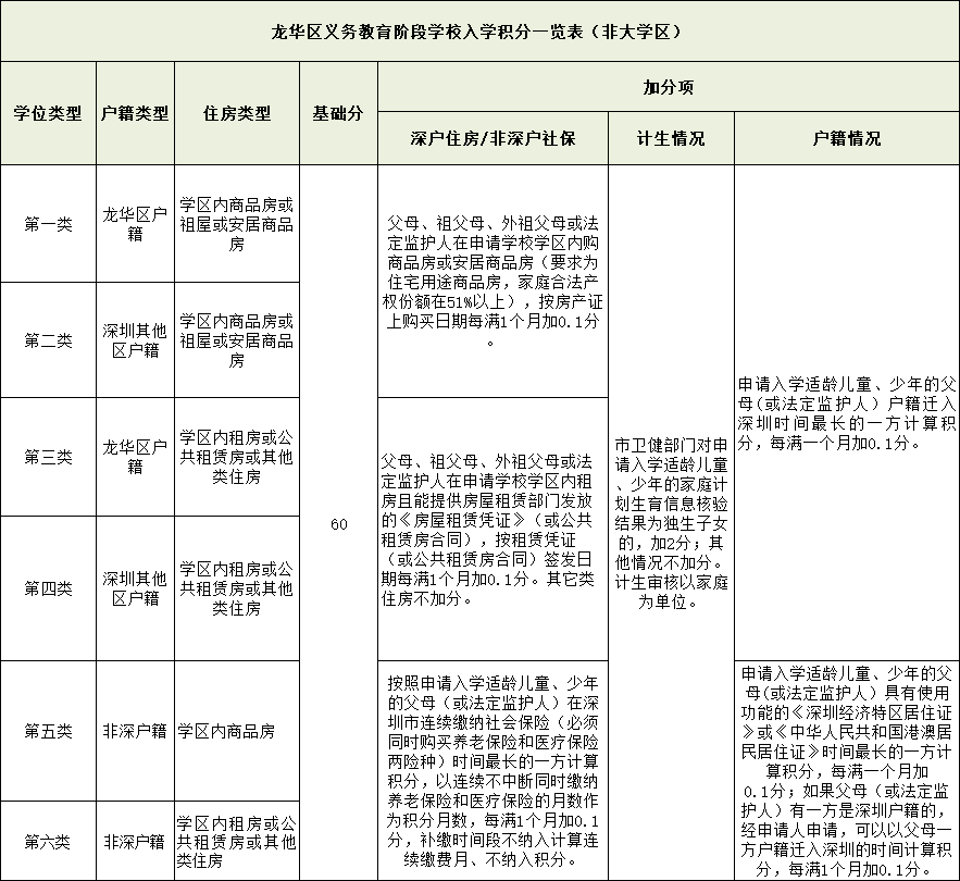 大鹏新区户籍,学区商品房(父母或其他法定监护人有学区合法产权房<含安居型商品房、人才住房>且产权份额大于50%<不含50%>,下同);或大鹏新区学区户籍,学区祖屋。大鹏新区户籍,学区商品房第2类:基础分85分大鹏新区学区户籍,学区特殊住房(父母或其他法定监护人有自建房、军产房、集资房、集体宿舍、商务公寓(必须为家庭名下少有住房)、祖父母或外祖父母拥有学区合法产权房且产权份额大于50%<不含50%>,下同)。第3类:基础分80分大鹏新区学区户籍,学区租房(含公共租赁房、人才住房,下同);或深圳其他区户籍,学区商品房。第4类:基础分75分大鹏新区户籍,父母或其他法定监护人有学区特殊住房;或非深户籍,学区商品房。第5类:基础分为70分大鹏新区户籍,学区租房;或深圳其他区户籍,父母或其他法定监护人有学区特殊住房。第6类:基础分为65分深圳市其他区户籍,学区租房;或非深圳户籍,父母或其他法定监护人有学区特殊住房或学区租房。