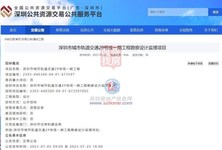 7月5日,29号线一期工程勘察设计监理项目招标公告对外发布;此次招标部分估价:1911.7779 万元。
