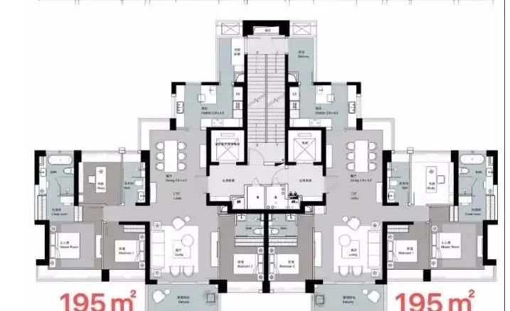 而车库建筑面积约6.7万㎡,为除了住宅外的较大配比,可以说海德园的车位相当充裕了。A区1栋、2栋为38层的塔楼,预计推售195㎡4房2厅3卫的户型,梯户比为2梯2户。