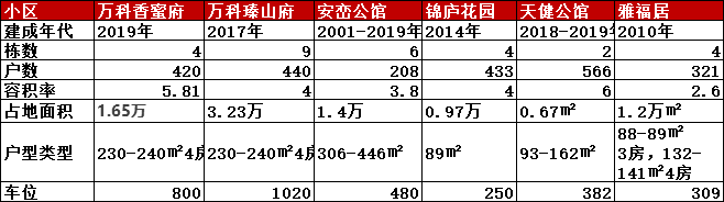 而从占地面积来看,万科瑧山府的地块是较大的,相比之下,海德园两个地块加起来的面积要稍大一些。这几个小区的平均容积率为4.37左右,其中距离较近的万科瑧山府一二期和锦庐花园均低于平均值,容积率均为4。而从车位比来看,除了万科瑧山府一期至三期和安峦公馆,其他小区的车位比都比较紧张。