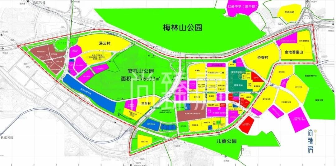 安托山片区东接香蜜湖、南临农科车公庙、西近华侨城、北靠塘朗山,周边被多个公园及高端产业带所包围,可算得上是出则繁华,入则静谧。有两条地铁站,7号线、2号线。
