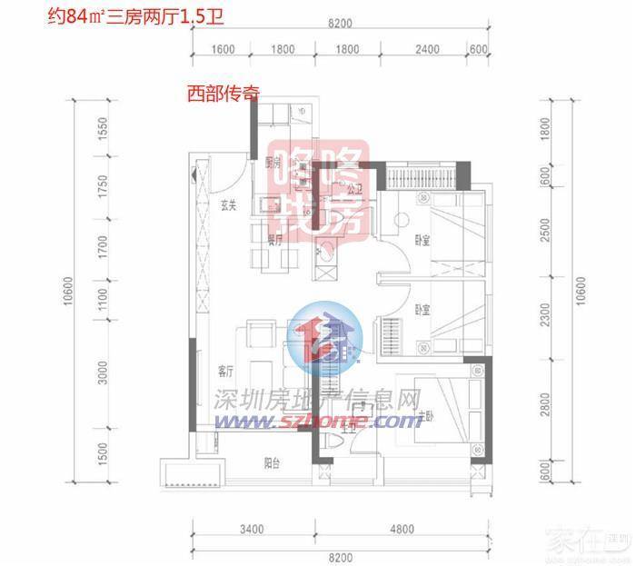 建面约84㎡三房两厅两卫