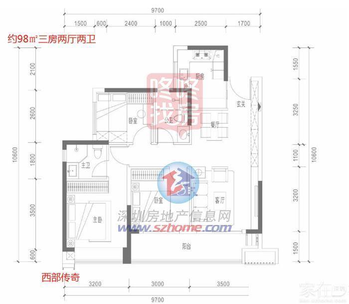 建面约98㎡三房两厅两卫