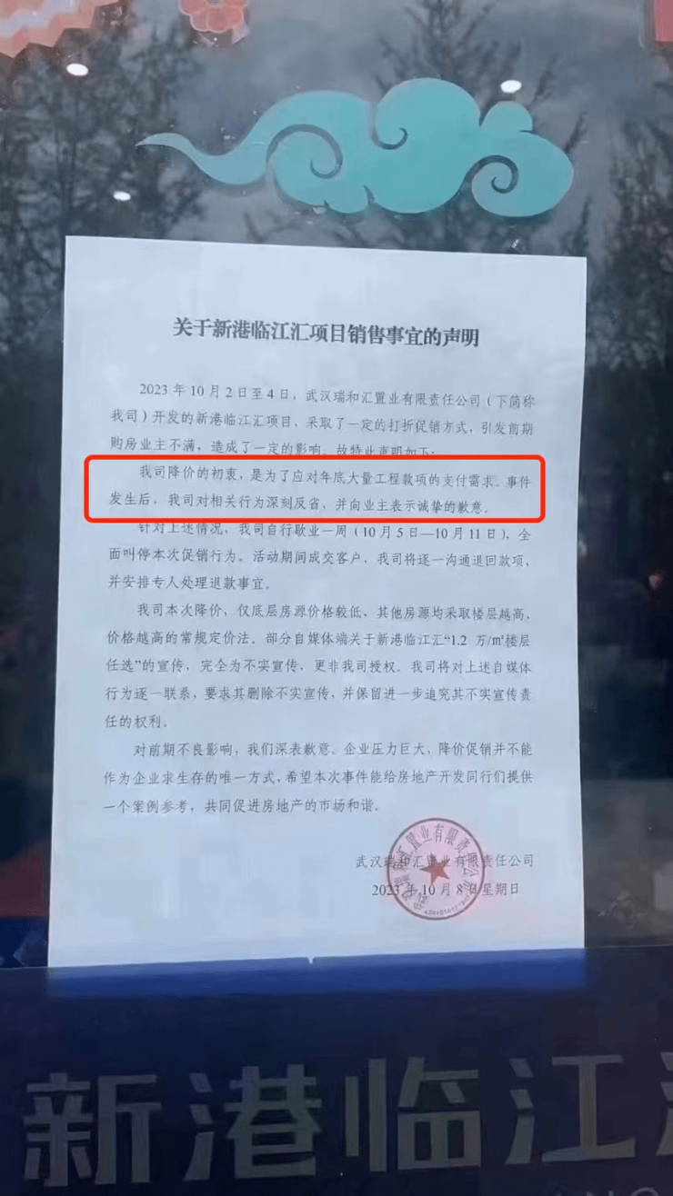 日前,一份“关于新港临江汇项目销售事宜的说明”在网络上流传。在这份声明中,开发商武汉瑞和汇置业表示,因项目采取了一定的打折促销方式,引发前期购房业主不满,售楼部自行歇业一周,活动期间成交客户,将逐一沟通退回款项并安排专人处理退款事宜。