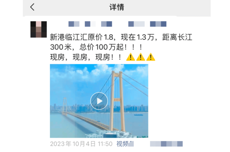 记者在武汉多名房产经纪人朋友圈也看到了该项目推广宣传,均号称“原价1.8万/平,现在1.3万/平,距离长江300米,总价100万起”。