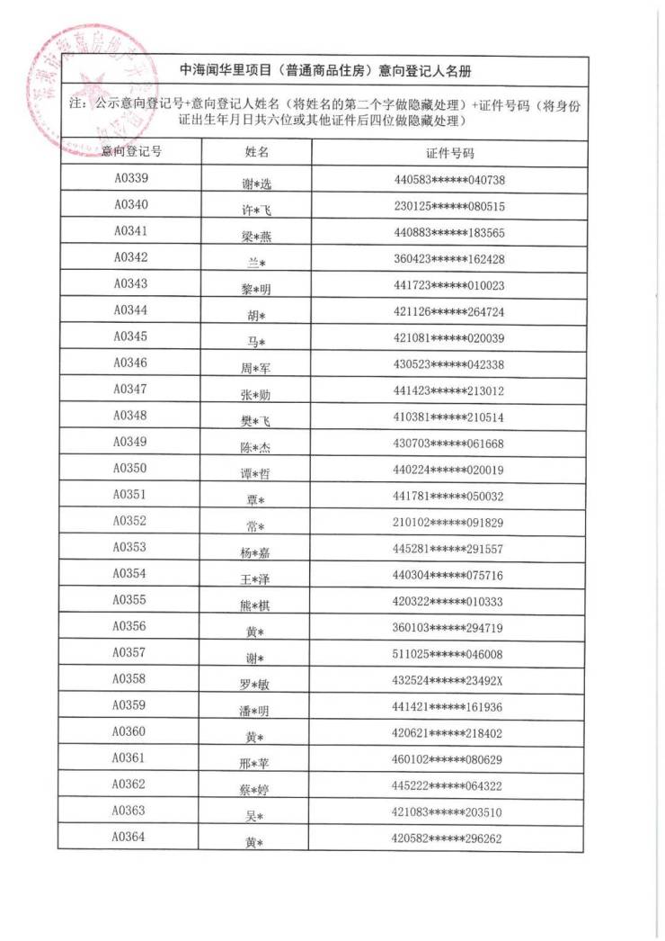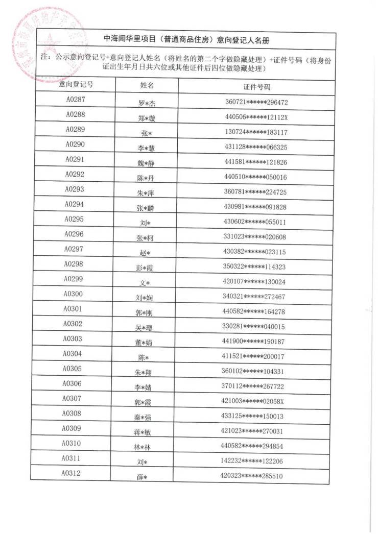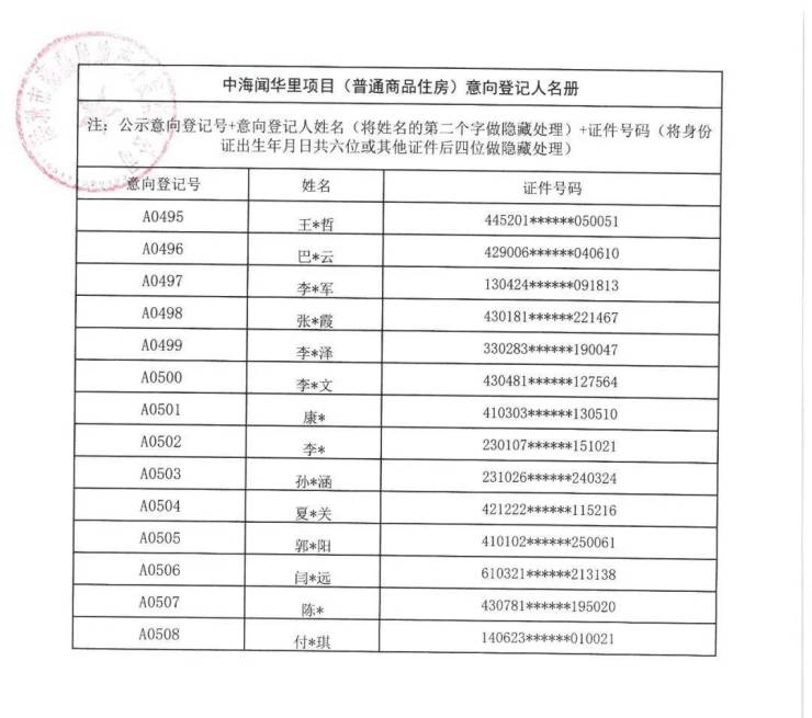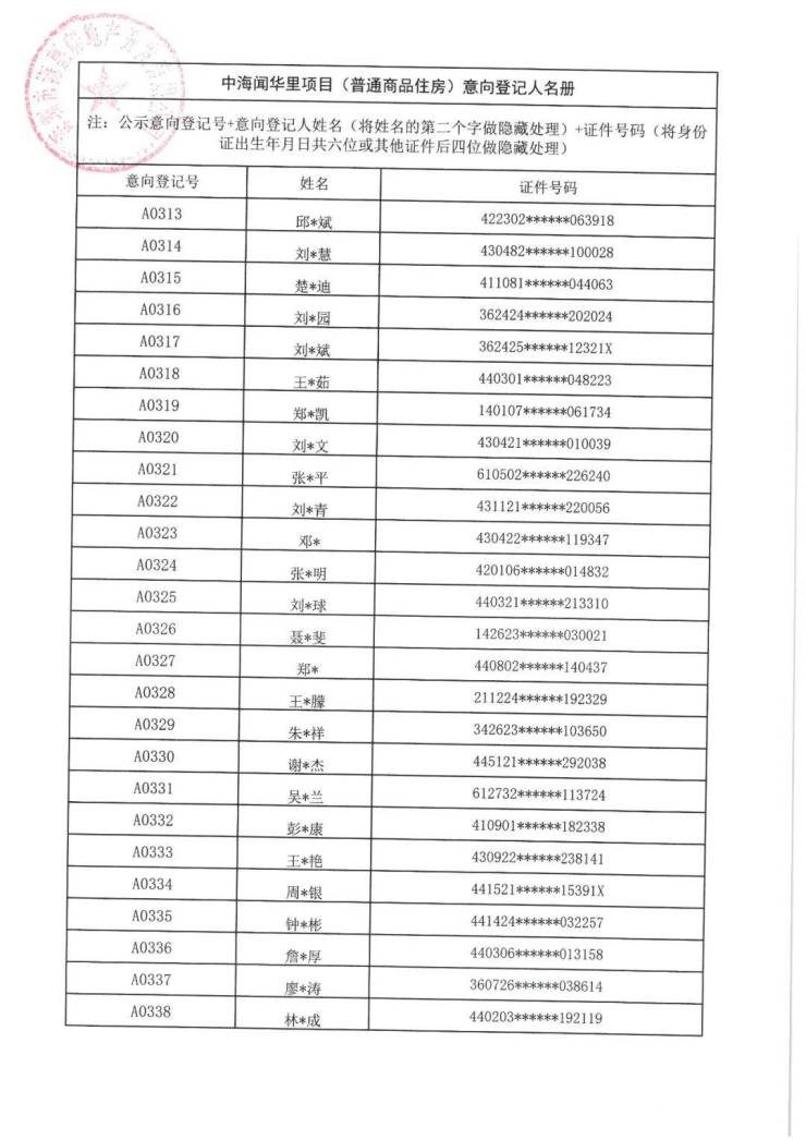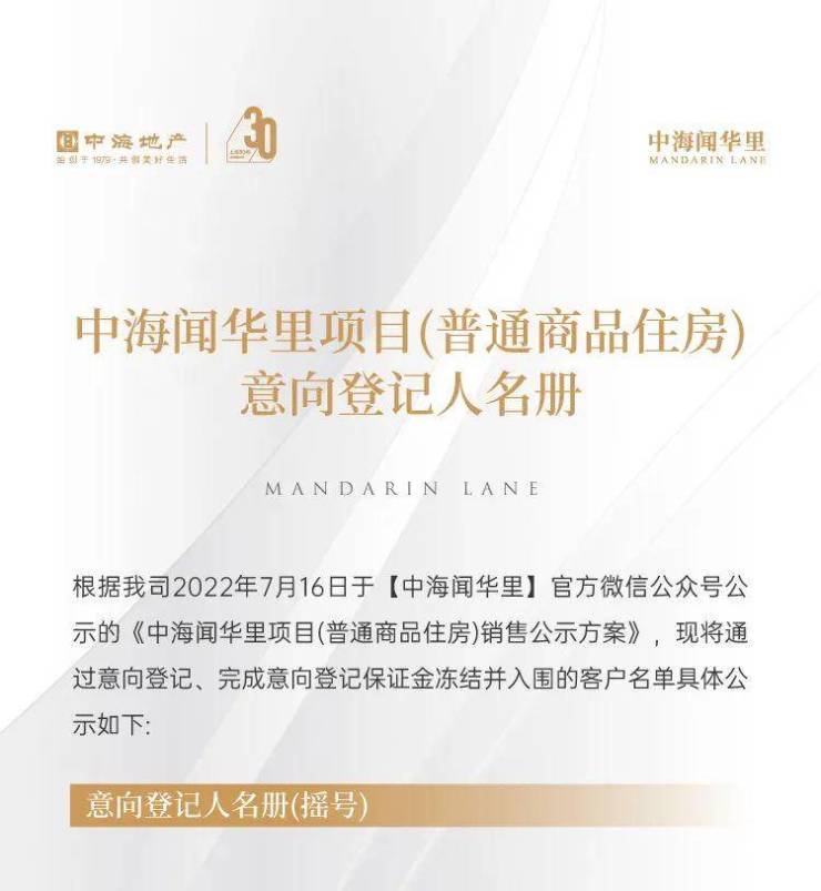 7月21日,中海闻华里项目(普通商品住房)意向登记人名册公示。本次共508批客户入围,将于7月22日10:00在深圳先行公证处进行选房顺序公证摇号。