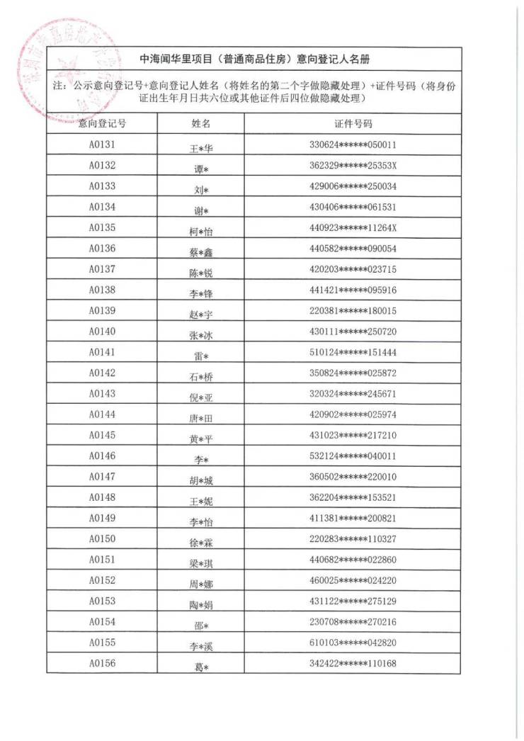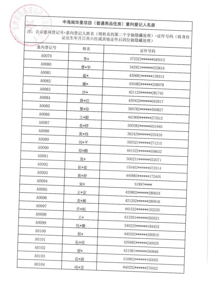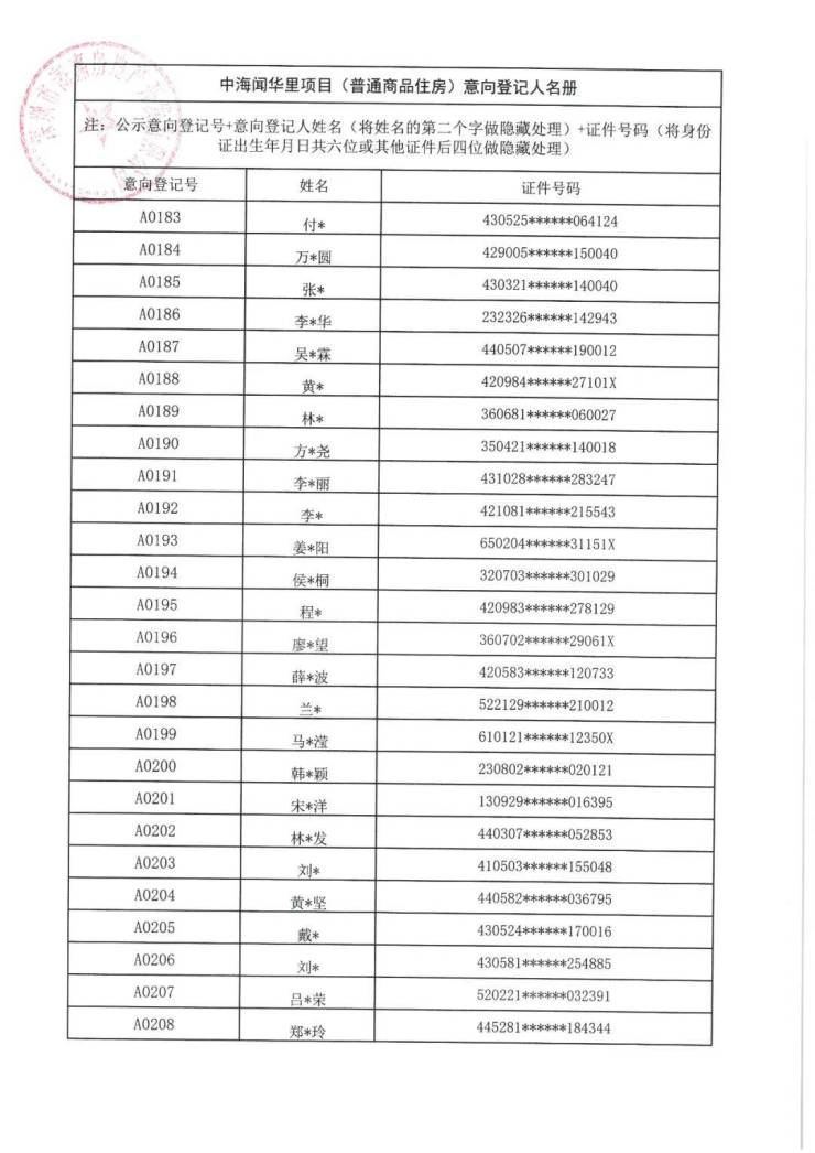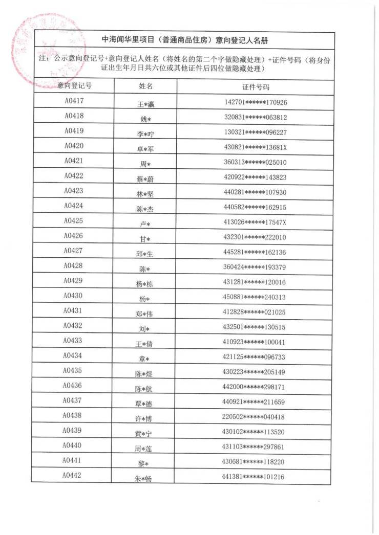 7月21日,中海闻华里项目(普通商品住房)意向登记人名册公示。本次共508批客户入围,将于7月22日10:00在深圳先行公证处进行选房顺序公证摇号。