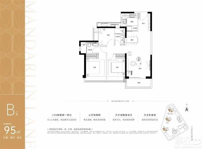 95平米大三房两厅两卫(朝南)