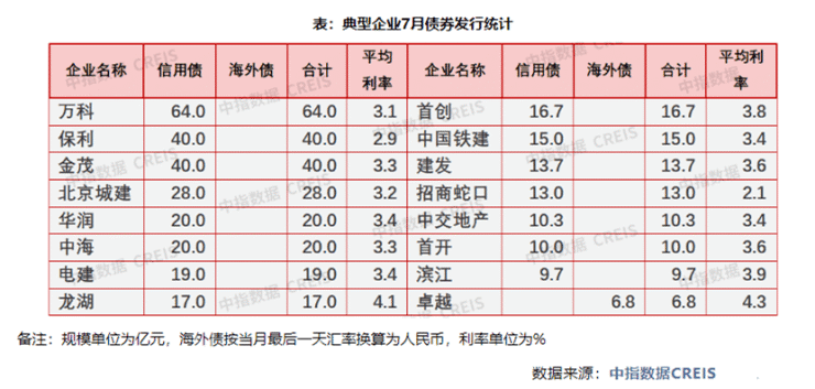 从7月房企融资表现来看,发债量较大的企业为万科。据克而瑞、中指研究院统计数据显示,7月万科发债总量达到了64亿元,共发行了两笔合计34亿元的公司债,以及一笔30亿元的绿色中期票据。而从发债年限来看,万科和保利都发行了一笔期限长达7年的公司债。