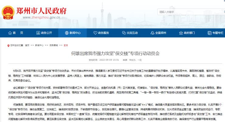 据郑州市人民政府消息,9月6日,郑州市还召开强力攻坚“保交楼”专项行动动员会。
