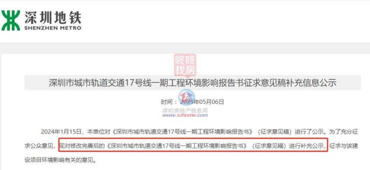 5月7日,为了充分征求公众意见,修改完善后的《深圳市城市轨道交通17号线一期工程环境影响报告书》(征求意见稿)进行补充公示,征求与该建设项目环境影响有关的意见。