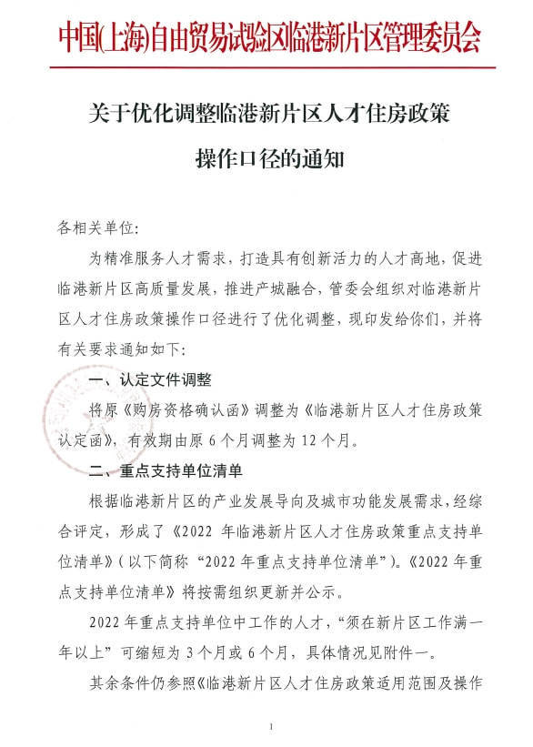 在认定文件上,《通知》将原《购房资格确认函》调整为《临港新片区人才住房政策认定函》,有效期由原6个月调整为12个月;人才的认定条件也降低了,之前要求在临港工作满一年以上,现在缩短为3个月或6个月。