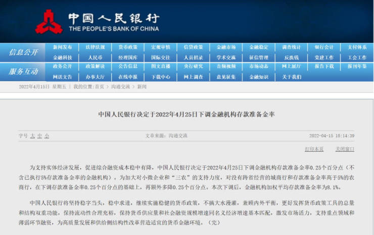 上次调整存款准备金率,是在去年12月15日,时隔4个月。