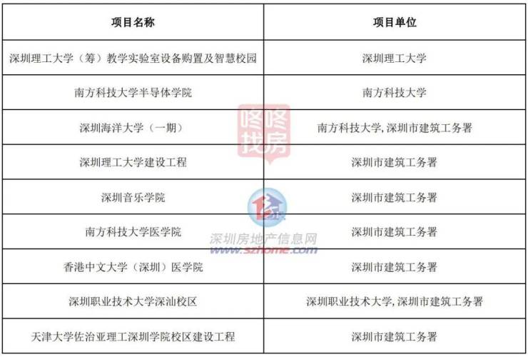 包括深圳海洋大学(一期)、深圳理工大学、深圳音乐学院、南方科技大学医学院、南方科技大学半导体学院、香港中文大学(深圳)医学院、深圳职业技术大学深汕校区等。