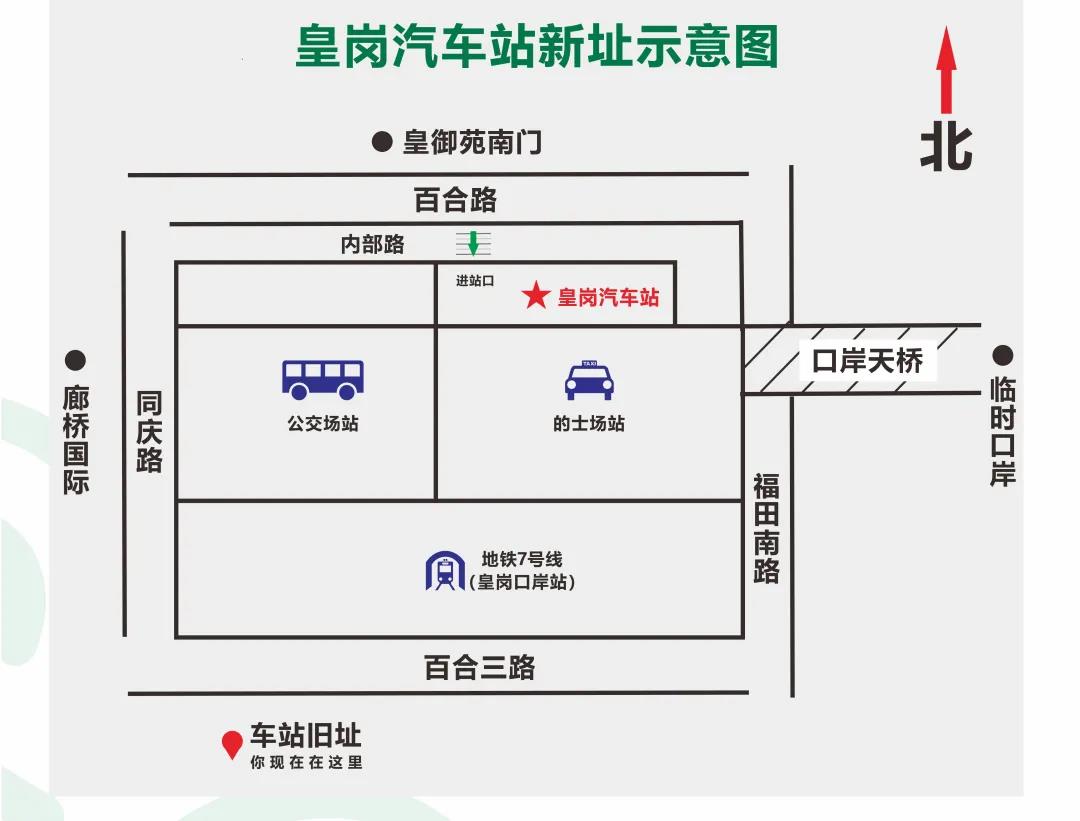 另外,由于皇岗口岸改造的需要,皇岗汽车站已搬迁至皇岗口岸公交总站东侧新址运营(详见示意图)。