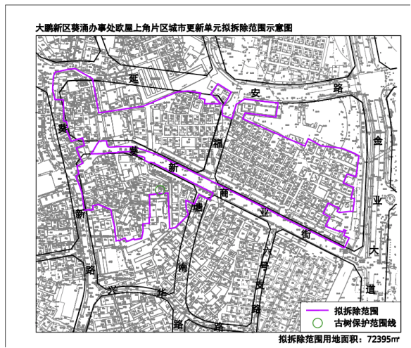 项目位于大鹏新区葵涌中心区,北临延安路,西临福新路,东临金业大道。更新单元用地面积81249.8平方米,拆除范围用地面积72394.5平方米。