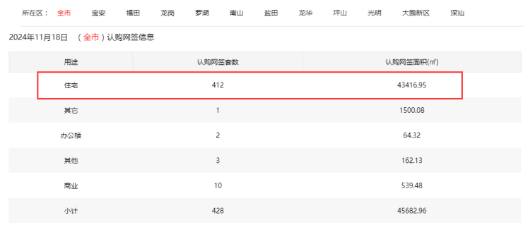 2024年11月18日新房住宅认购网签412套。宝安50套;福田4套;龙岗60套;罗湖9套;南山45套;盐田3套;龙华206套;坪山13套;光明21套;大鹏0套;深汕1套。