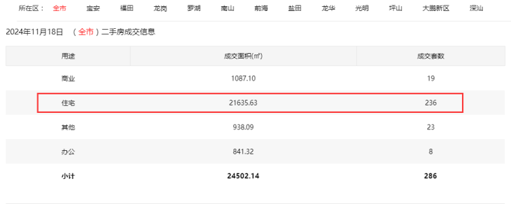 2024年11月18日二手房住宅网签236套,宝安26套;福田37套;龙岗62套;罗湖28套;南山45套;盐田4套;龙华21套;坪山10套;光明3套;大鹏0套。