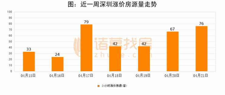 根据诸葛找房数据显示,深圳24小时涨价房源量为76套,较04月20日增加9套,环比上涨13.4%。与此同时,涨价房源占比小幅扩大,业主信心有所提升。