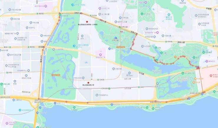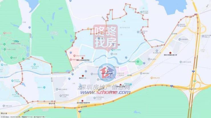 南山区平山学校初中学段与南山区丽湖学校初中学段组成初中大学区的招生范围图示如下: