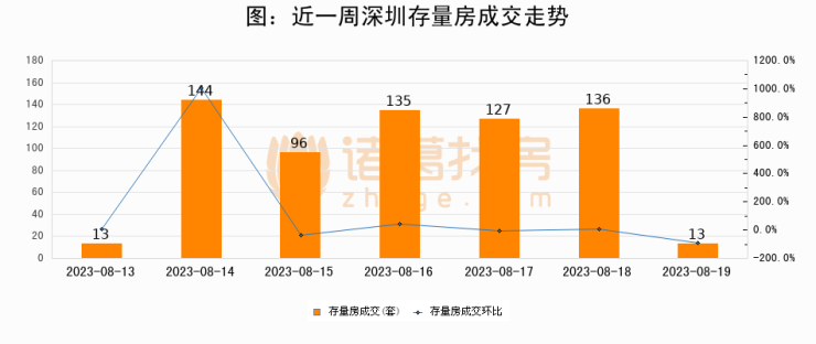 从存量房来看,2023年08月19日深圳存量房单日成交13套,比昨日减少123套,环比下降90.4%。从近一周存量房成交来看,深圳存量房日均成交套数为94套,08月19日单日成交13套,低于近一周平均水平86.2%。
