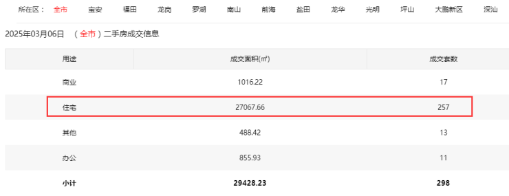 2025年3月6日二手房住宅网签257套。其中,宝安35套;福田38套;龙岗65套;罗湖49套;南山44套;盐田3套;龙华25套;坪山5套;光明2套;大鹏2套。