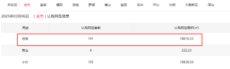 2025年3月6日新房住宅认购网签191套。其中,宝安76套;福田9套;龙岗14套;罗湖0套;南山3套;盐田1套;龙华64套;坪山5套;光明19套;大鹏0套;深汕0套。