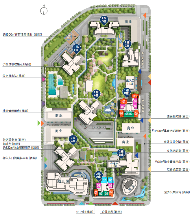 此外,小区还带有1栋幼儿园,以及1万㎡住宅底商,园林带泳池,小区外部还配建有篮球场、羽毛球场,整体的生活配套很充足。
