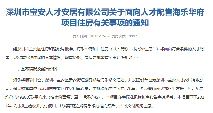 12月2日,宝安住建局发布宝安可售人才房海乐府的配售公告,海乐华府本批配售270套房源,均为建面约85㎡的3房户型,配售均价为49200元/㎡(毛坯价格),线上申请认购时间为:2023年12月3日9:00至2023年12月8日18:00。