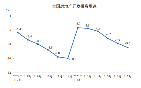1—7月份,全国房地产开发投资67717亿元,同比下降8.5%;其中,住宅投资51485亿元,下降7.6%。
