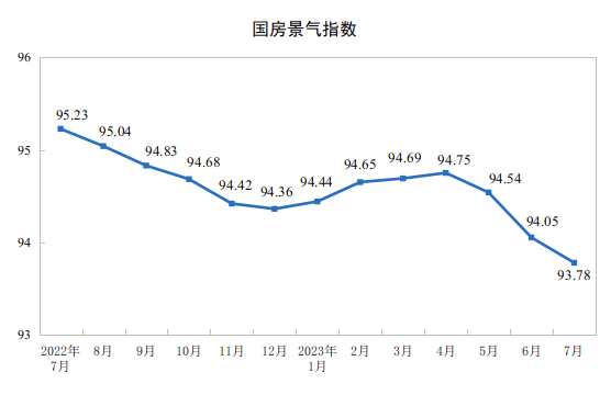 值得一提的,7月份,房地产开发景气指数(简称“国房景气指数”)为93.78,持续下探。