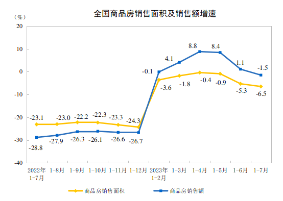 今日,8月15日,国家统计局披露2023年1-7月全国房地产市场基本情况。
