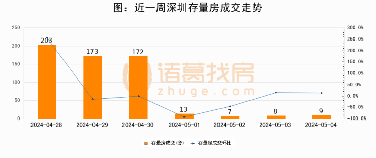 从存量房来看,2024年05月04日深圳存量房单日成交9套,比昨日增加1套,环比上涨12.5%。从近一周存量房成交来看,深圳存量房日均成交套数为83套,05月04日单日成交9套,低于近一周平均水平89.2%。
