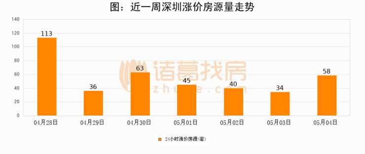 根据诸葛找房数据显示,深圳24小时涨价房源量为58套,较05月03日增加24套,环比上涨70.6%。与此同时,涨价房源占比小幅扩大,业主信心有所提升。