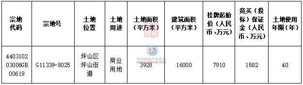 宗地号G11339-8025,土地位置坪山区坪山街道,土地用途商业用地,土地面积3928平方米,建筑面积16000平方米,挂牌起始价7910万元,土地使用年限40年。此宗地计划8月3日出让。