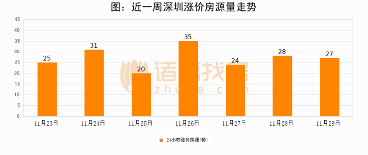 根据诸葛找房数据显示,深圳24小时涨价房源量为27套,较11月28日减少1套,环比下降3.6%。与此同时,涨价房源占比小幅回落,对于购房者来说是一个入市窗口期,购房者可抓住时机入市。