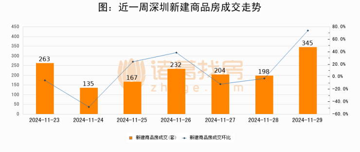 根据深圳市住房和城乡建设局数据显示,2024年11月29日深圳新建商品房成交345套,较昨日增加147套,环比上涨74.2%