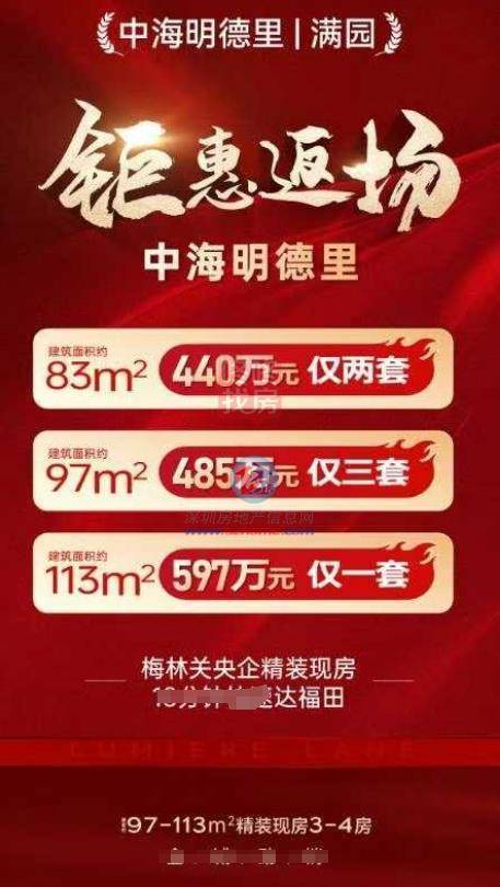 据了解,位于龙华的中海明德里最近推出了数套特惠房源,据海报资料显示,建面约83平的房源2套,仅440万;建面约97平的约3套,总价约485万;建面约113平的房源1套,总价597万;单价约5万-5.3万/平。