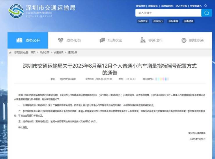 7月30日,深圳市交通运输局发布《关于2025年8月至12月个人普通小汽车增量指标摇号配置方式的通告》。