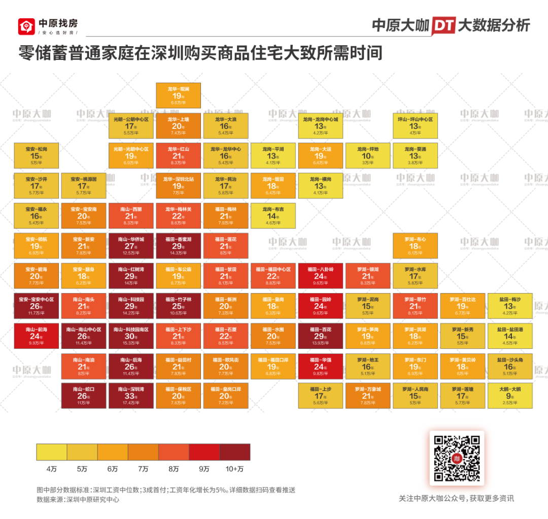 根据结果,我们能看到一个普通家庭攒够深圳房屋的首付是在9-33年,其中较高的深圳湾片区需要33年,较低的大鹏区是9年。平均年限是19.6年,中位数是21年。
