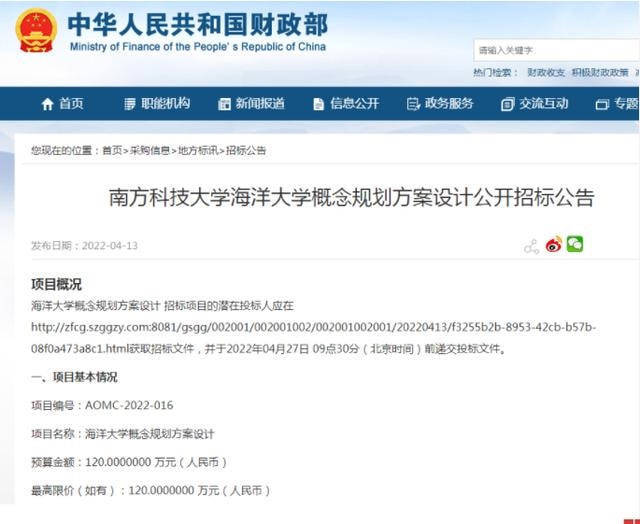 而就在几天前,财政部官网上发布了南方科技大学海洋大学概念规划设计方案公开招标的公告,透露了海洋大学办学目标、办学规模、学科设置等重要信息。