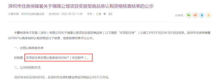 刚刚,深圳住建局公示光明瑞璟公馆安居型商品房的认购资格结果,有696户家庭入围。其中,两房437批,三房259批意向认购家庭。