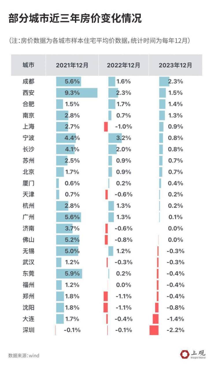 在整体楼市冷清的情况下,成都、西安、合肥、南京在去年12月的样本住宅平均价仍有增长,同比增幅分别为2.3%、1.5%、1.4%和1.3%。不过,增速与往年相比也在下滑。