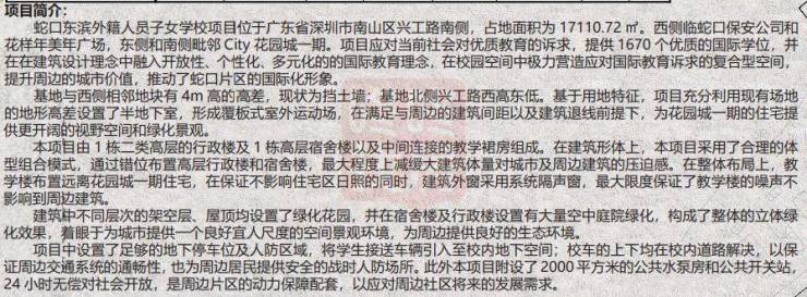 该项目坐落在前海蛇口片区,目前,该片区只有6所由厂房、写字楼等改造、改建的外籍人员子女学校,各学校办学条件、硬件设施较为简陋、社会认可度不高,已一定程度上滞后于深圳经济社会发展水平,与深圳作为先行示范区、蛇口作为自贸区的发展要求不符。