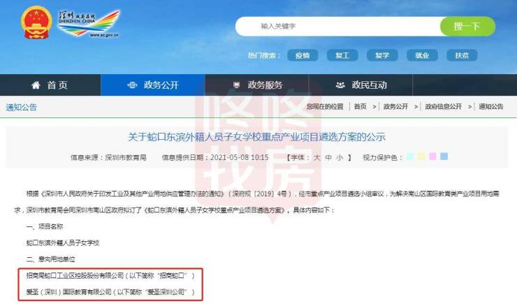 在2021年5月,深圳市教育局发布了《蛇口东滨外籍人员子女学校重点产业项目遴选方案》,意向用地单位为招商局蛇口工业区控股股份有限公司、爱圣(深圳)国际教育有限公司。