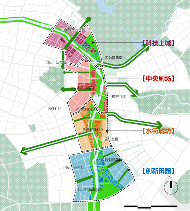 围绕科技水岸、活力客厅、智造慧谷3段规划主题,推出科技上城、中央剧场、水街城坊、创新田园4个城市级空间产品,塑造滨水文化、休闲与特色商业体验。