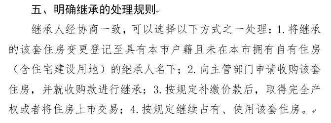 后续涉及到的继承问题,此次也提出了处理规则,主要有2种继承方法,一种是房屋继承,一种是收购款继承。其中,选择房屋继承方式的,继承人必须在本市无任何自有住房。
