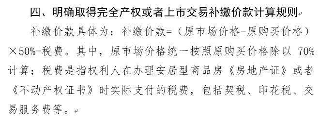 其中,对于业主们最关心的补缴额度,官方给出了一个计算办法:补缴价款=(原市场价格-原购买价格)×50%-税费。